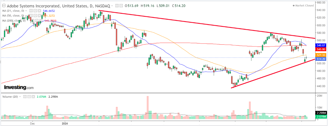截至周三收市,Adobe股价报于513.62美元,接近其2024年5月31日的低点433.97美元。公司当前市值为2280亿美元。