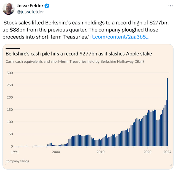 上图贴文翻译:出售部分股票后,伯克希尔的手头现金已达2770亿美元,创纪录新高,较上一季度增加了880已美元,并将这些现金投入到了短期美债中。