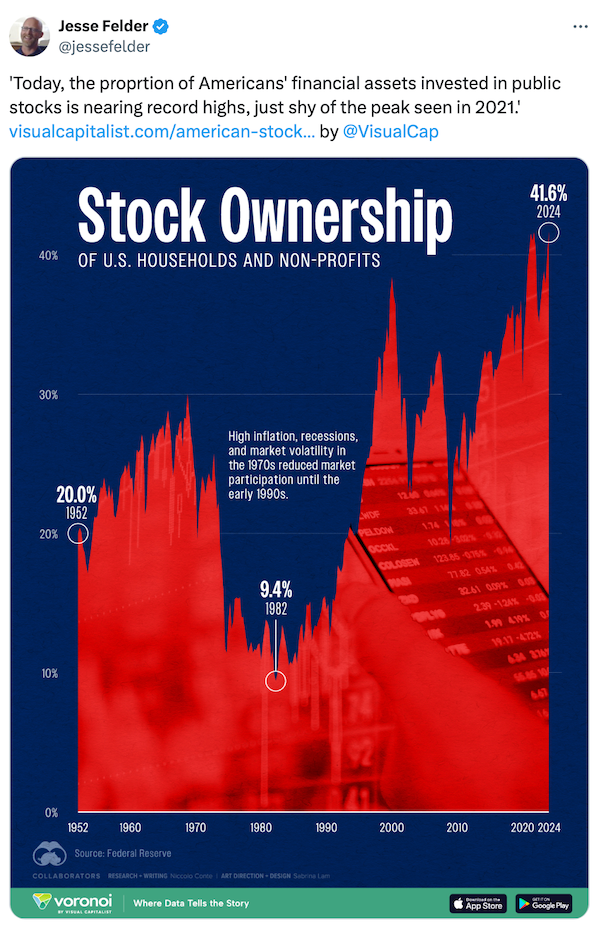 上图贴文翻译:当前,美国人投资上市股票的规模在金融资产投资中的比例正接近历史高位,仅次于2021年所达到的顶峰水平。