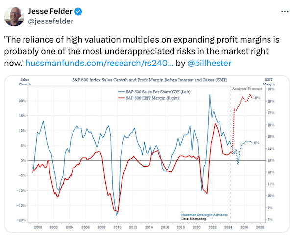 上图贴文翻译:目前市场上的高估值倍数依赖利润率扩张,这个风险可能是最被低估的风险之一。