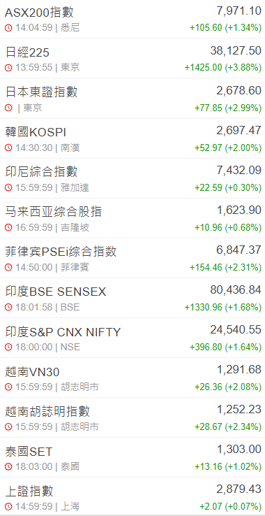 亚太股市多数上升,日经225指数飙升3.88%,东证指数升2.99%,韩国股市升2%。