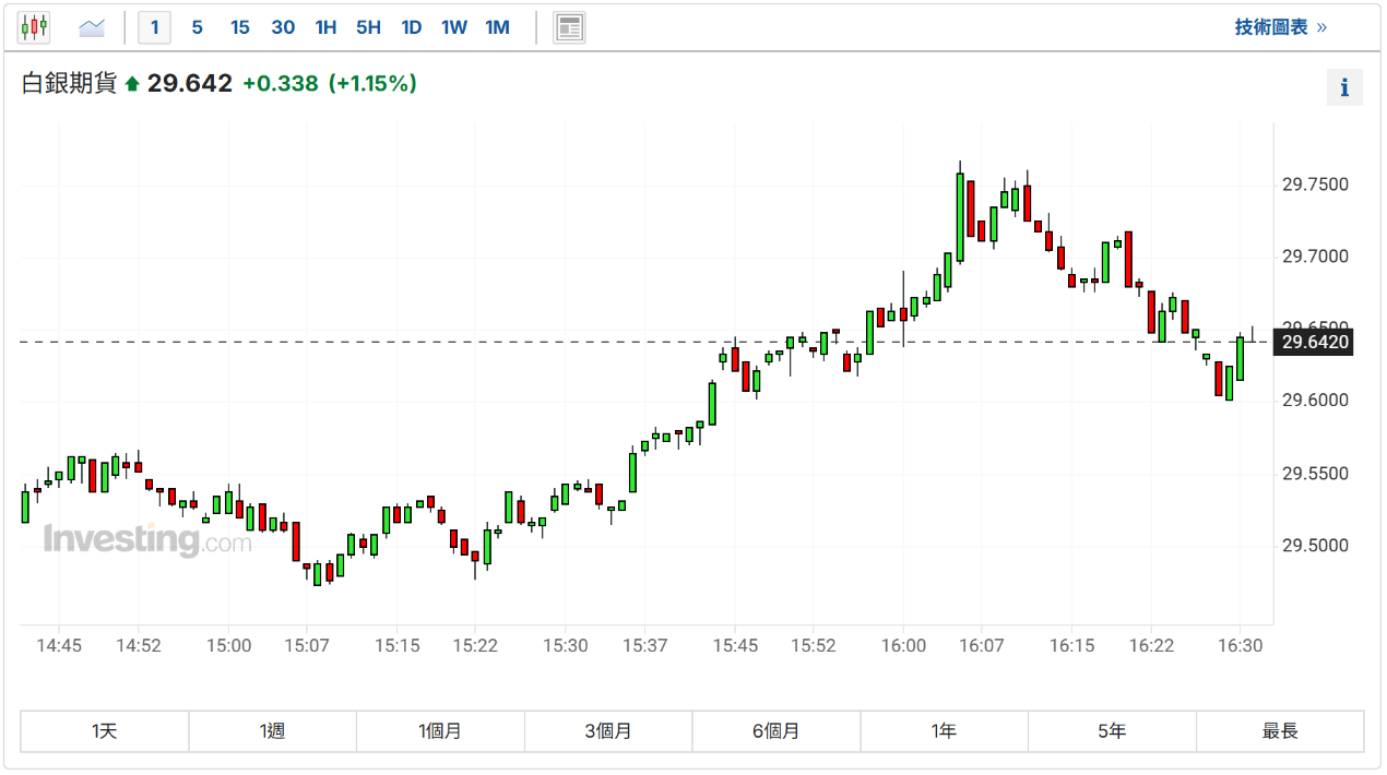 白银上涨势头紧随黄金!截至香港时间16:27(美国东部时间凌晨4:27),Investing.com大宗商品行情显示,XAG/USD价格涨0.41%,报29.5665美元/盎司;白银期货价格涨1.15%,报29.642美元/盎司。
