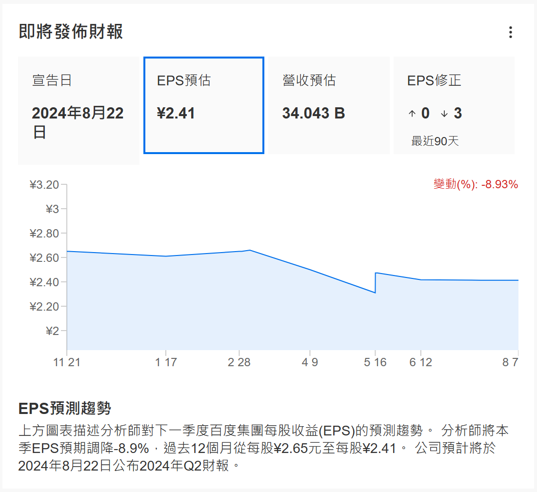 根据InvestingPro工具预测,百度Q2每股收益同比下滑17%至2.41元,营收达340亿元,与去年同期数值相近。有分析师指出,百度在AI领域的投入可能会短期内影响其广告业务的收入增长。