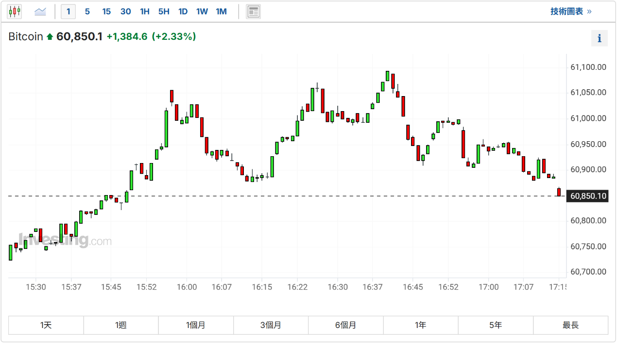 比特币现涨2.33%,报60850.1美元。加密货币概念股多数上涨,Riot涨0.24%。