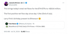 7月30日,以太坊现货ETF流入3400万美元,转为正值